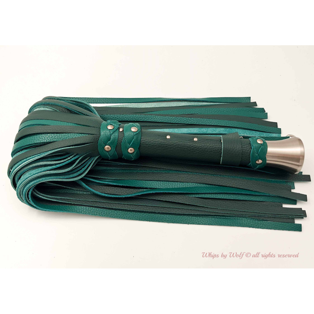 A stunning handmade leather huge flogger made of +100 falls, weighing 1kg+ with a balanced handle to give thuddy and weighted flogging a new dimension.